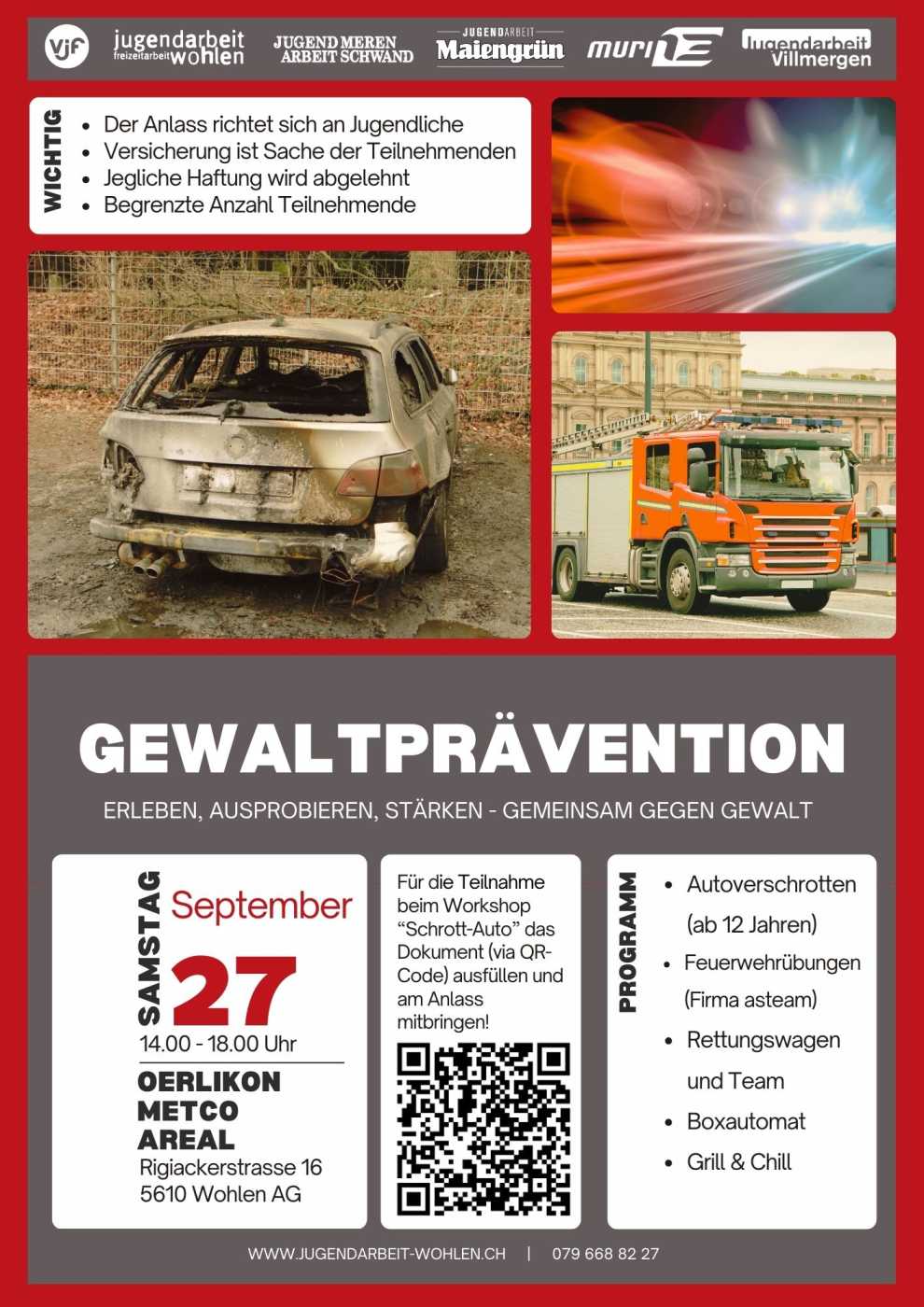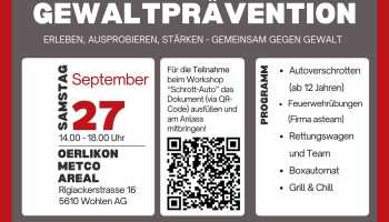 Am Samstag, 27. September 2025, findet in Wohlen der regional organisierte Gewaltpräventionstag für Jugendliche statt. Gemeinsam mit Jugendlichen entwickelt, stehen Workshops wie «Schrott-Auto», Erste Hilfe durch die Sanitäter des Spitals Bülach sowie Feuerwehr-Einsätze mit dem asteam Wohlen im Zentrum. Ziel ist es, negative Emotionen kontrolliert abzubauen und Handlungskompetenzen zu stärken. Ein Beizli und ein Boxautomat runden das Programm ab; der Anlass dauert von 14:00 bis 18:00 Uhr, richtet sich ausschliesslich an Jugendliche und findet bei guter Witterung auf dem Parkplatz der Firma Oerlikon Metco in Wohlen statt.